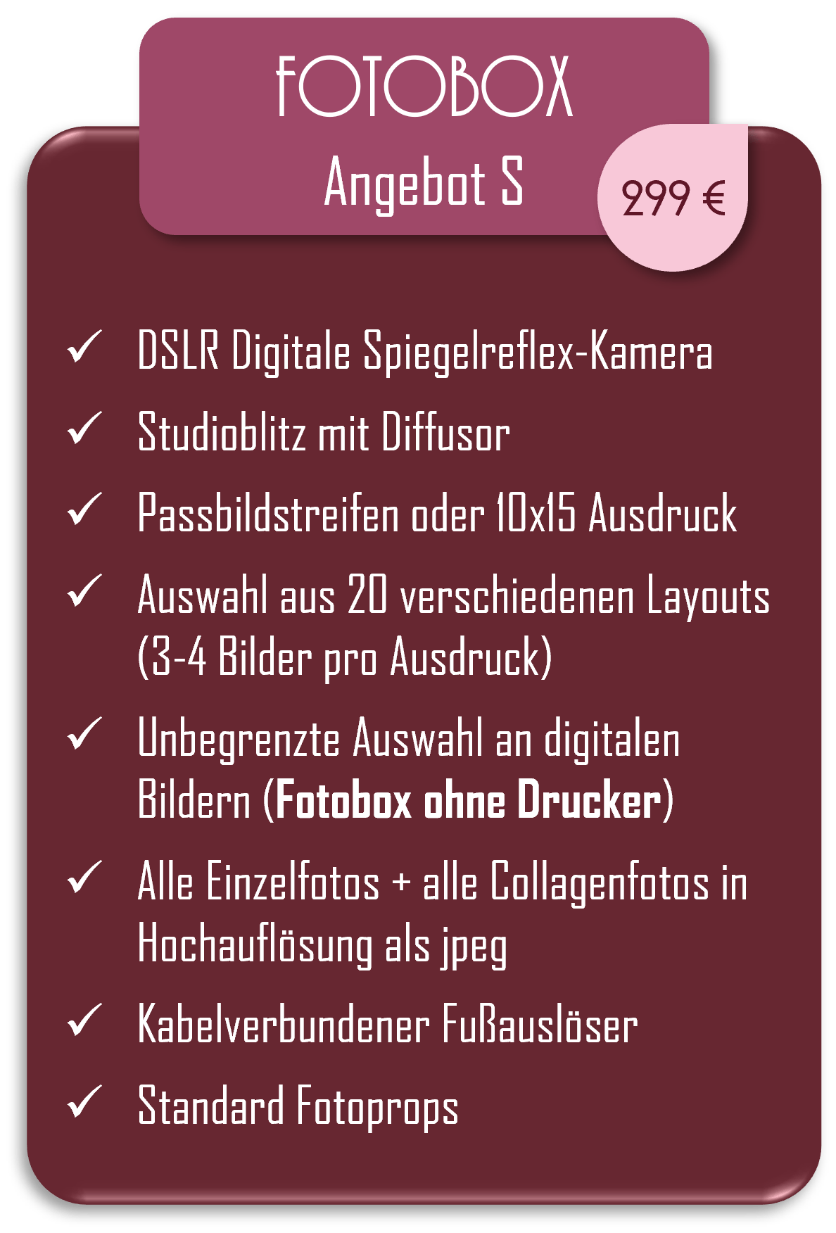 Entweder nehmt ihr unsere Fotobox mit platzsparendem Stativ und außenstehendem Drucker.