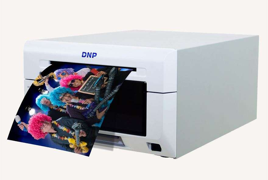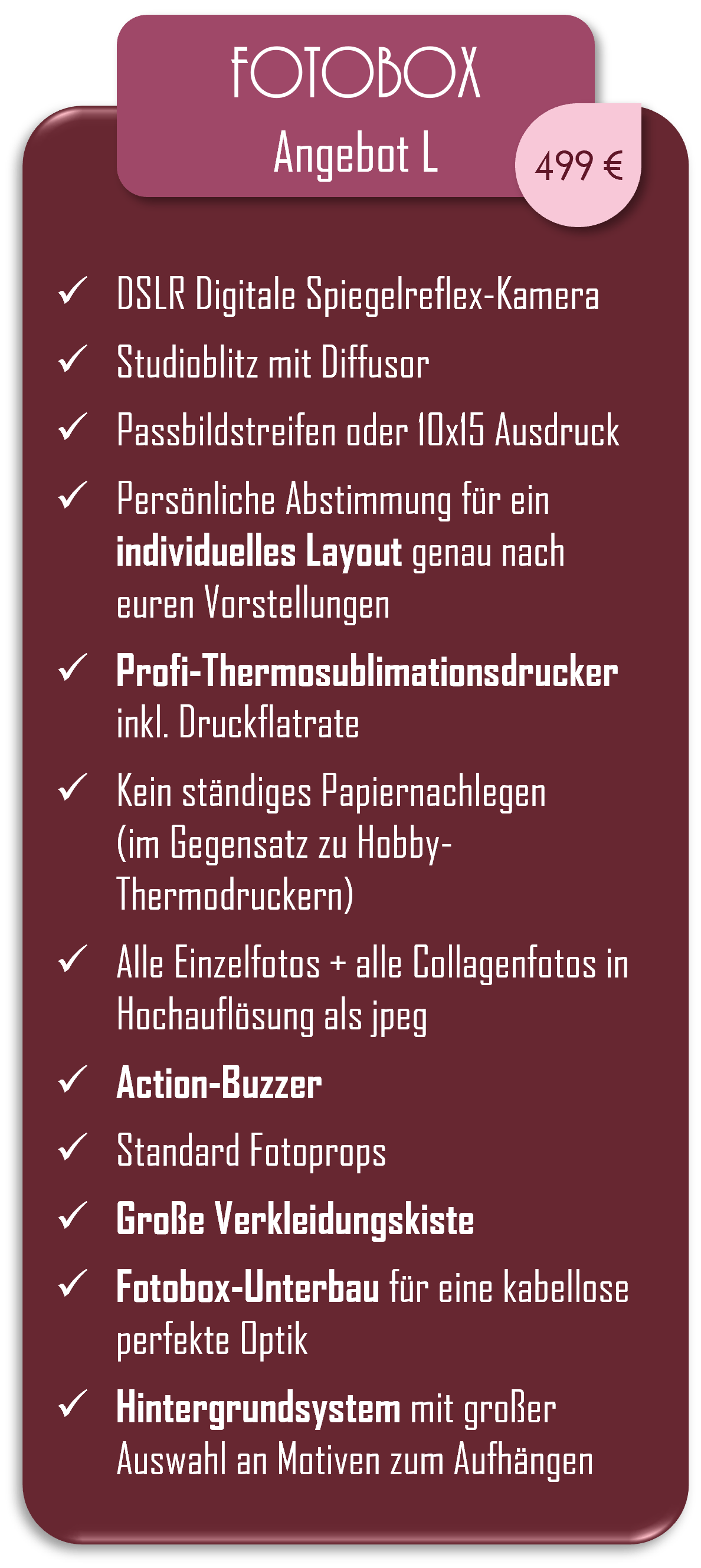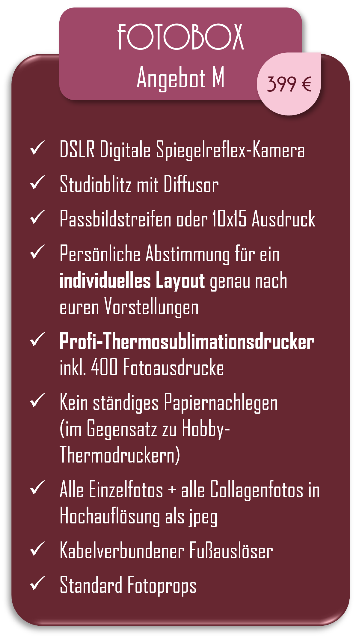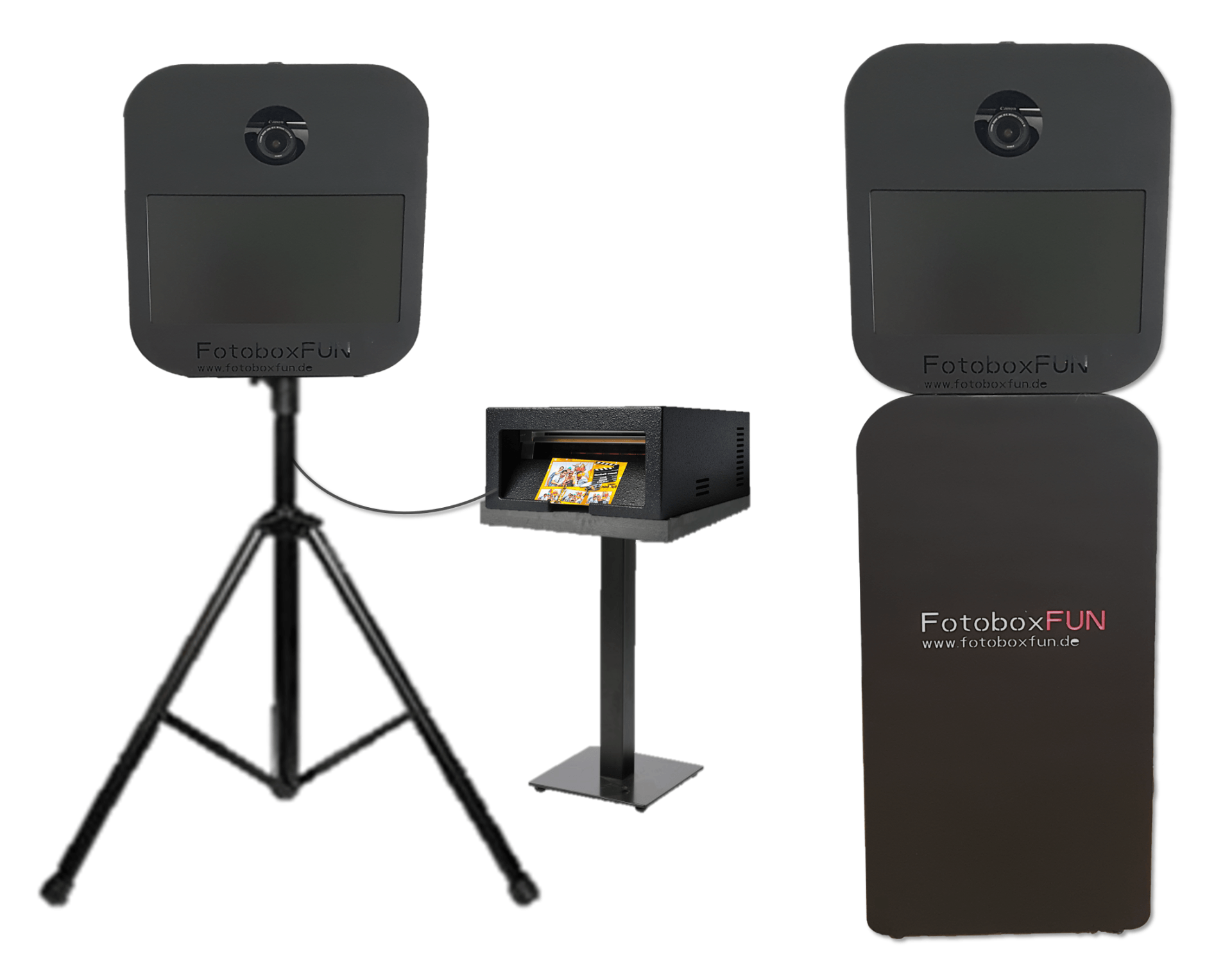Entweder nehmt ihr unsere Fotobox mit platzsparendem Stativ und außenstehendem Drucker.